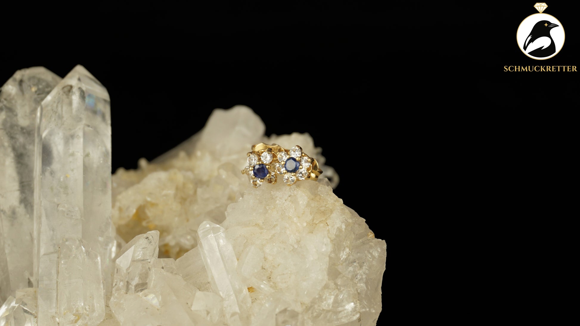 Sehr schöne Saphire in klarer, blauer Farbe. Dazu eine Entourage aus weißem Topas.