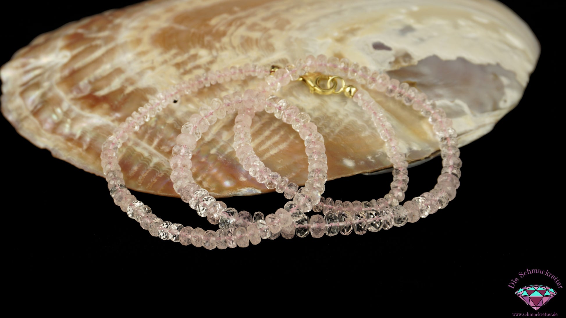 Zusätzliche Infos: Rosafarbener Morganit (Beryll), facettiert (Gesamtgewicht circa 75ct); Kalotten und Verschluss aus 375er Gelbgold