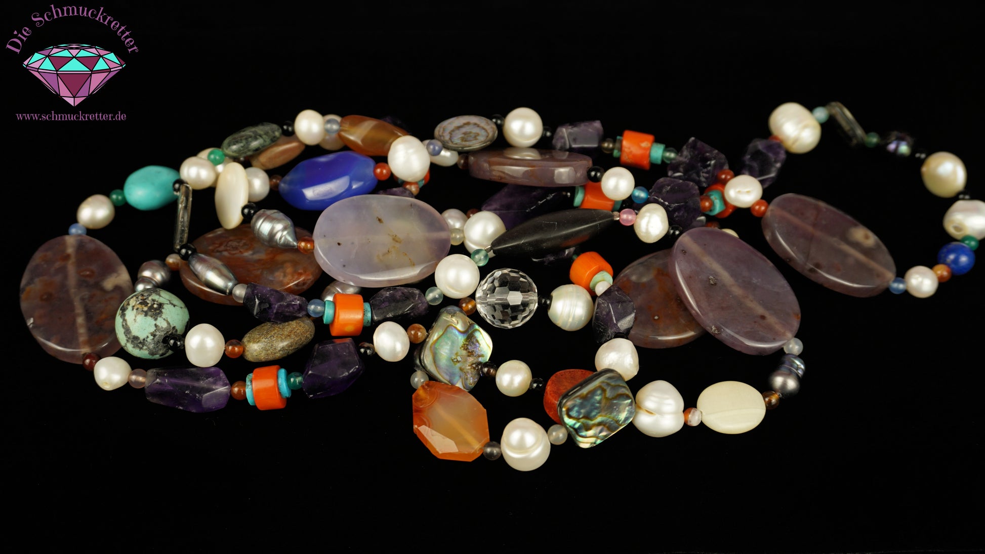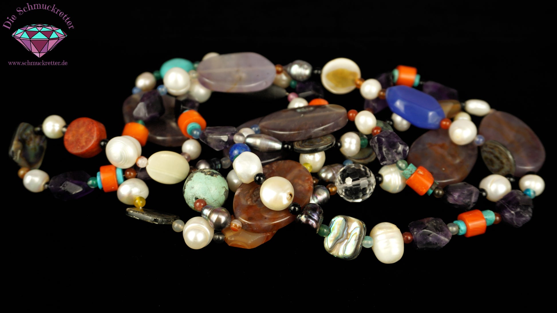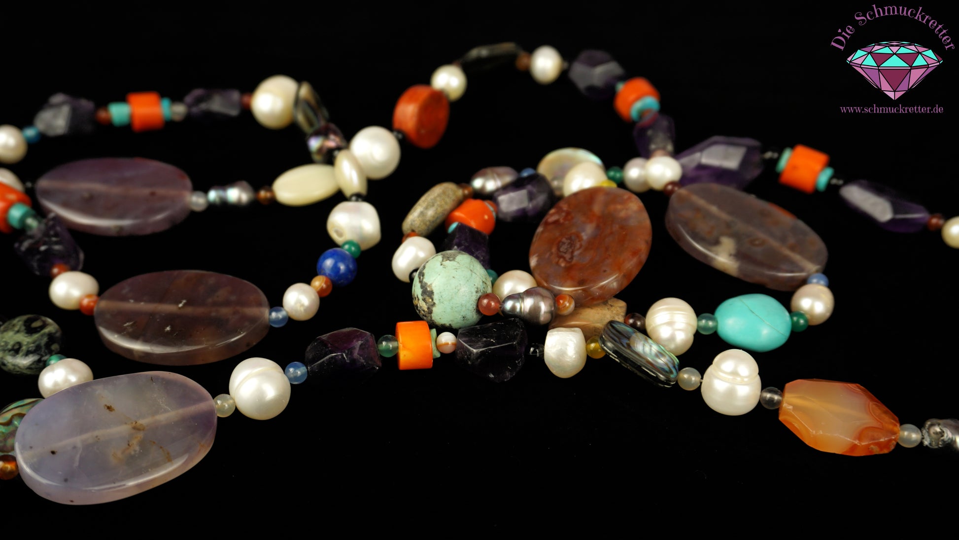 Lange Endloskette mit breiten Achatscheiben, Koralle, Perlen, Amethyst...