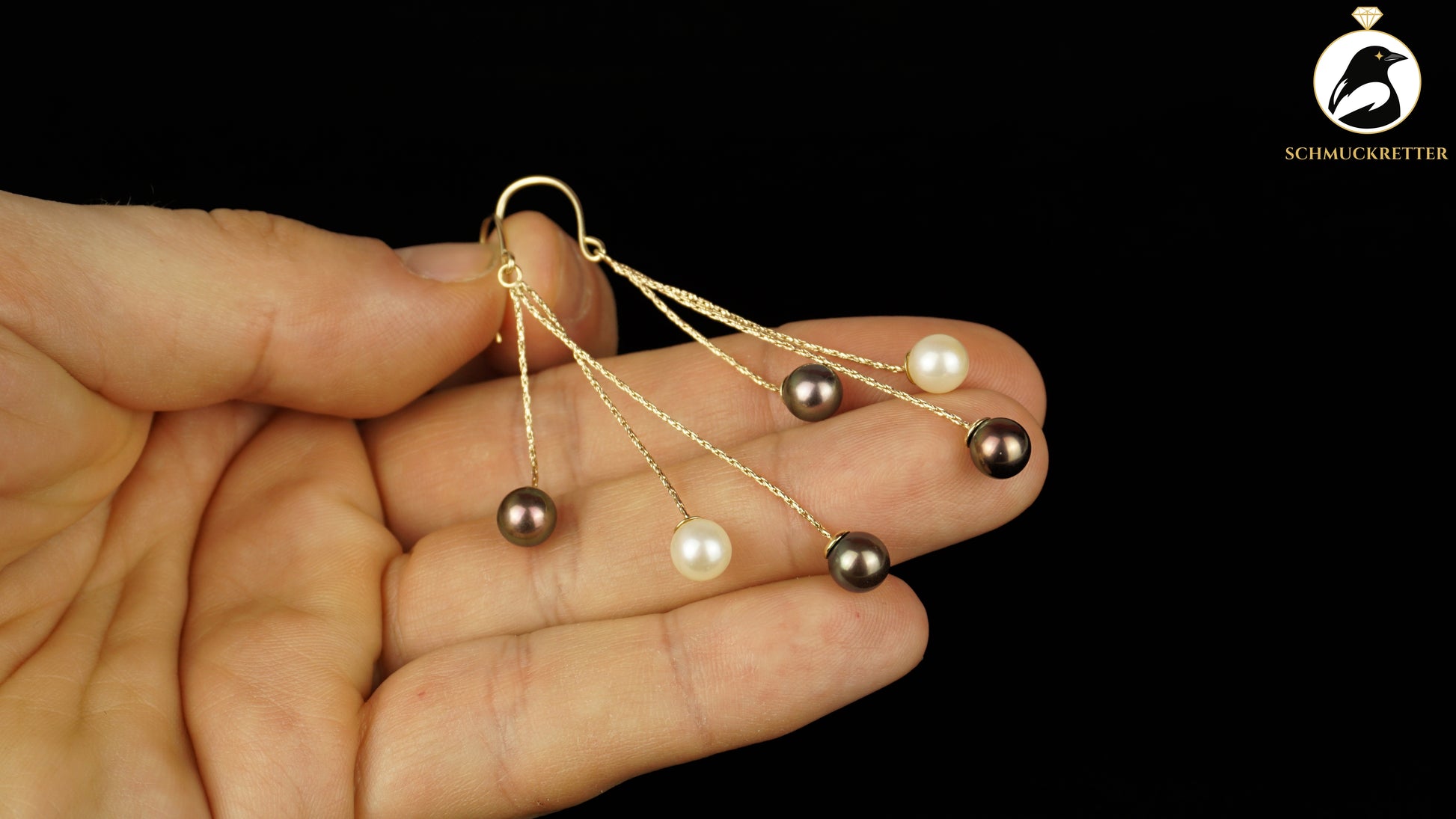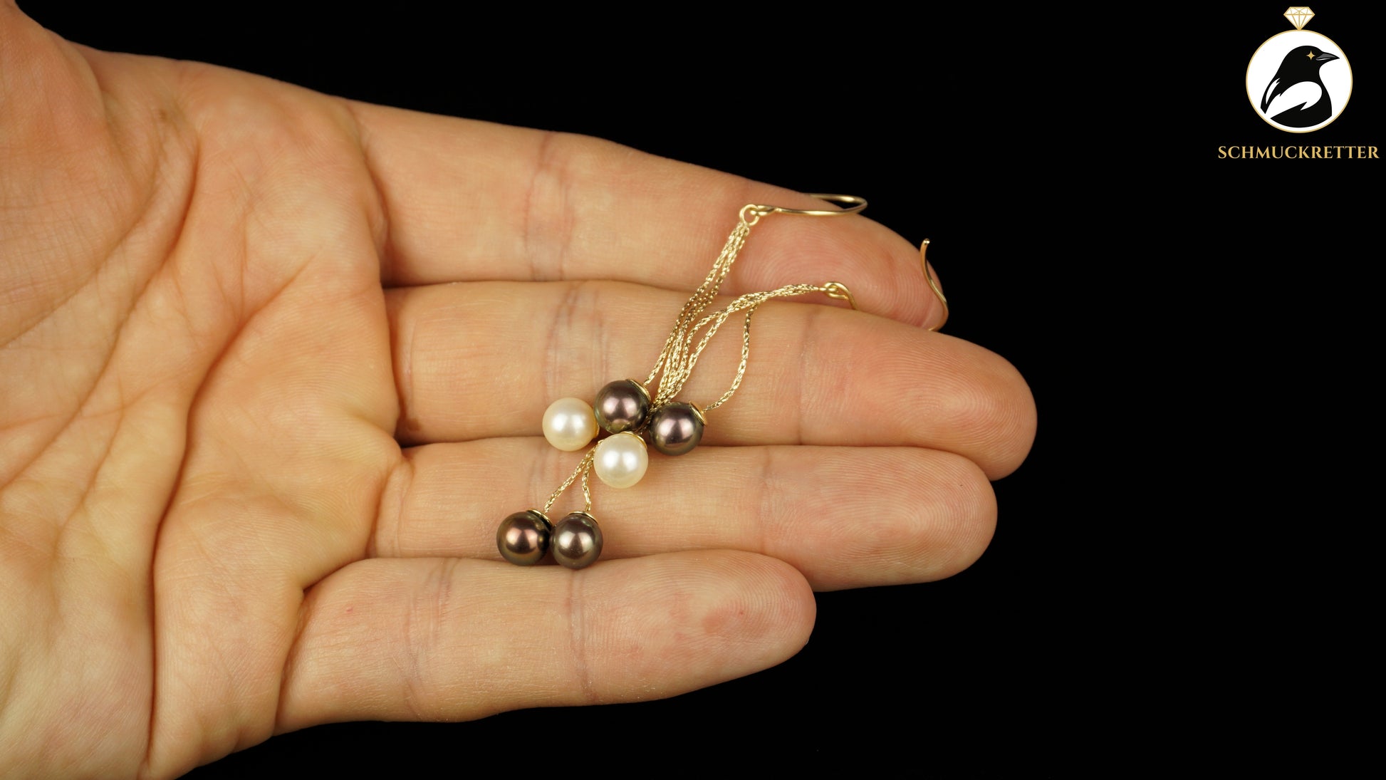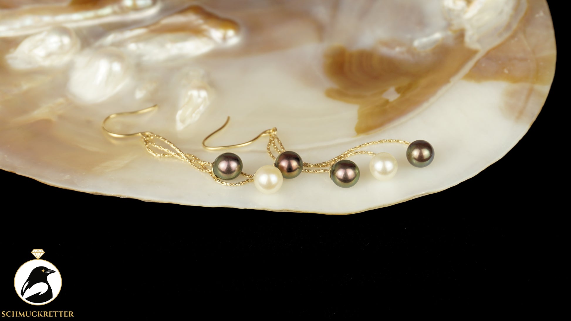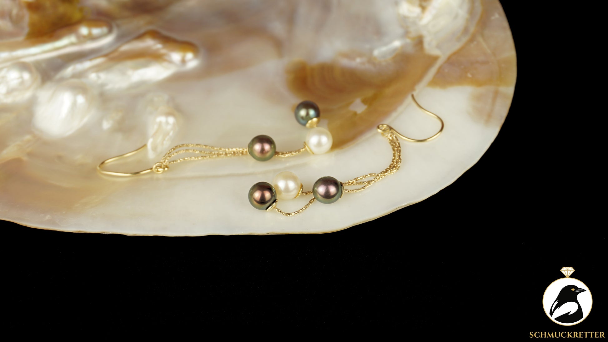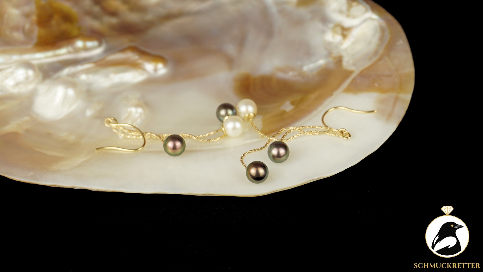 Elegante Ohrringe aus 585 Gold mit feinen Akoya- und Tahiti-Perlen – vereint werden feiner, silbrig schimmernder Akoya-Lüster und die faszinierenden, natürlich dunklen Farbnuancen der Tahitiperlen aus der Südsee (Französisch-Polynesien). Je nach Licht zeigen die Tahitiperlen schimmernde Töne von Grün, Anthrazit und Pflaume – lebendig, edel und sehr hochwertig anzusehen.